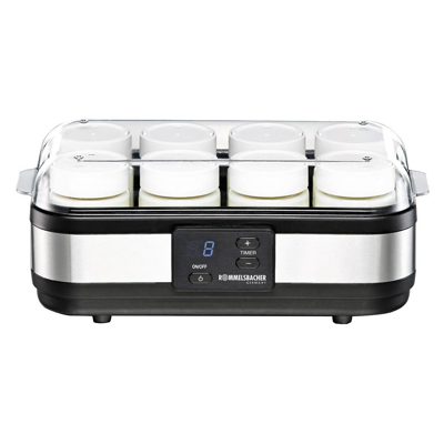 ROMMELSBACHER JG 40 – домашняя йогуртница, которая идеально подходит для приготовления йогурта, кефира, ряженки и других кисломолочных продуктов. Вы можете без труда приготовить свой самый любимый молочный продукт для перекуса. Домашний йогурт это совершенно натуральный продукт, без опасных ингредиентов. Употребляя его регулярно, вы укрепляете свое здоровье. За один раз в йогуртнице можно приготовить 1,2 литра полезного молочного продукта. Для этого в комплект включены 8 стеклянных баночек, каждая по по 150 мл, с крышками снабженные винтовой резьбой для более плотного закрывания. Крышки на баночках имеют особую конструкцию, на их поверхности можно установить дату, когда продукт изготовлен. Не надо наклеивать стикеры с датами, все очень просто и удобно. Если вы или ваши дети любят йогурт с фруктами или другими наполнителями, в готовый продукт перед употреблением можно положить любые ягоды или фрукты. На основе йогурта можно приготовить большое количество различных блюд таких как: соусы, пирожные, торты и др. Мощность йогуртницы 40 Вт. Устройство оборудовано таймером до 18 часов и автовыключением со звуковым сигналом. Прибор имеет защиту от перегрева и LCD- дисплей, а так же съемную прозрачную крышку. В комплект входит книга рецептов для йогуртницы и инструкция.