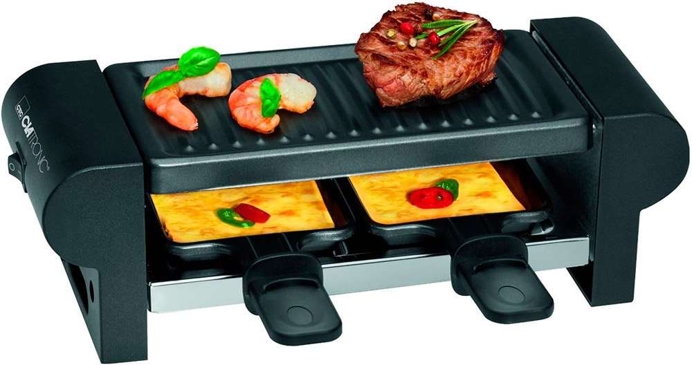 Раклетница Clatronic RG 3592 предназначена на две порции, в связи с наличием двух небольших противней. В комплекте также идёт ребристая съёмная панель для гриля, с антипригарным покрытием. Есть регулятор температуры, который обеспечит нужную степень прожарки.
