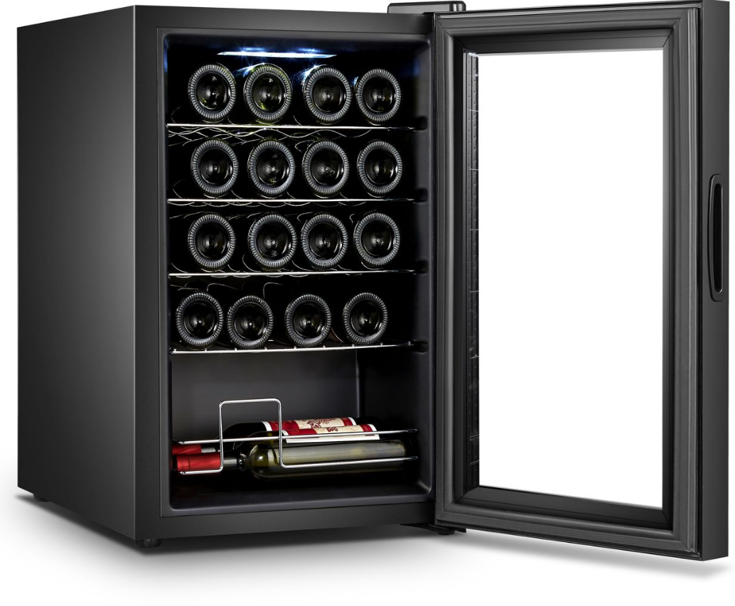 Охладитель вина со стеклянной дверцей и компрессором.